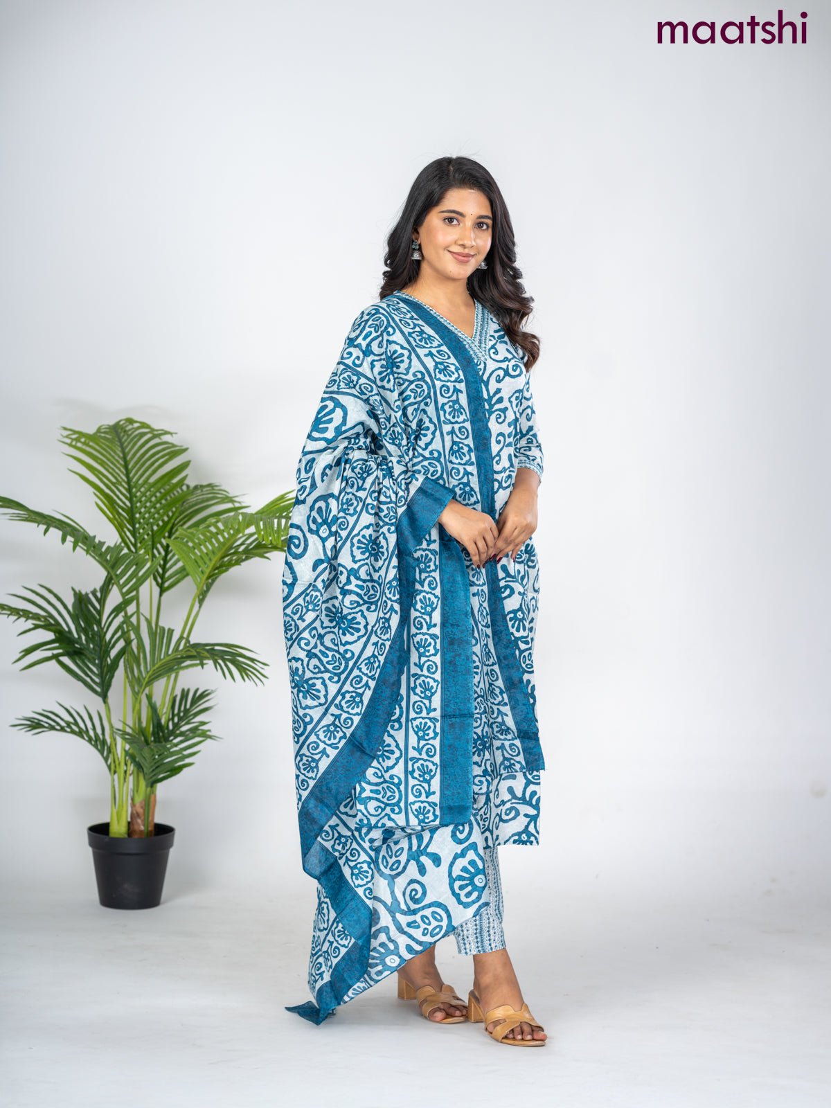 Semi cotton salwar suit grey and peacock blue with allover batik prints & sequin beaded work v neck pattern and straight cut pant & dupatta Semi cotton salwar suit grey and peacock blue with allover batik prints & sequin beaded work v neck pattern and straight cut pant & dupatta