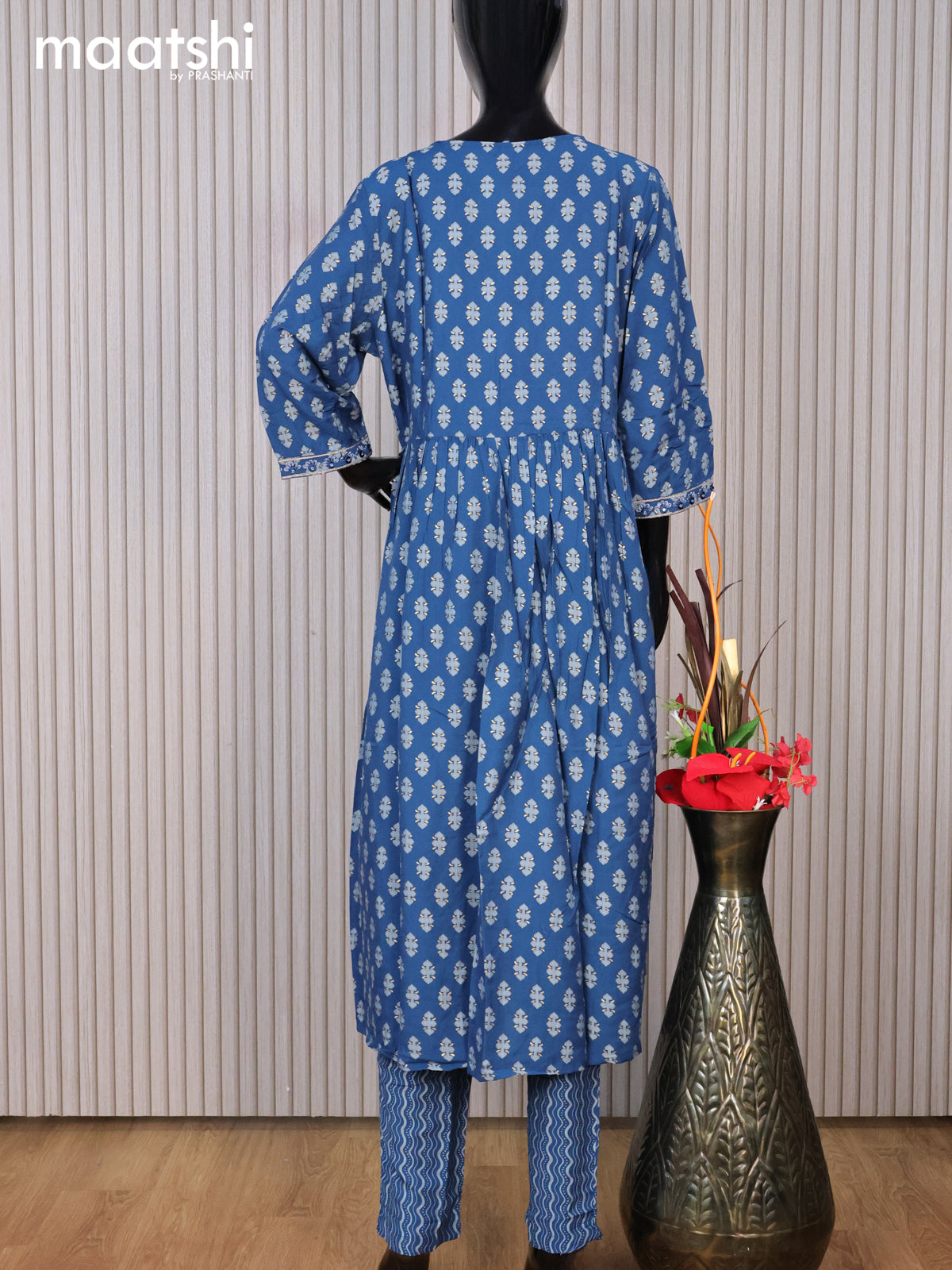 Modal readymade alia cut suit dark navy blue and with batik prints & mirror work neck pattern and straight cut pant & printed dupatta Modal readymade alia cut suit dark navy blue and with batik prints & mirror work neck pattern and straight cut pant & printed dupatta