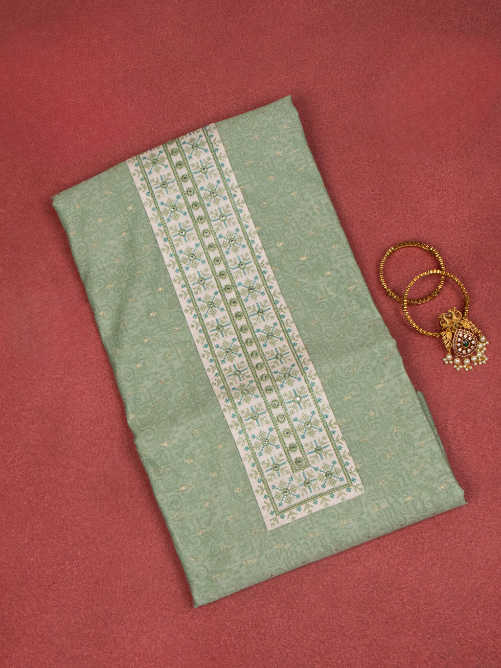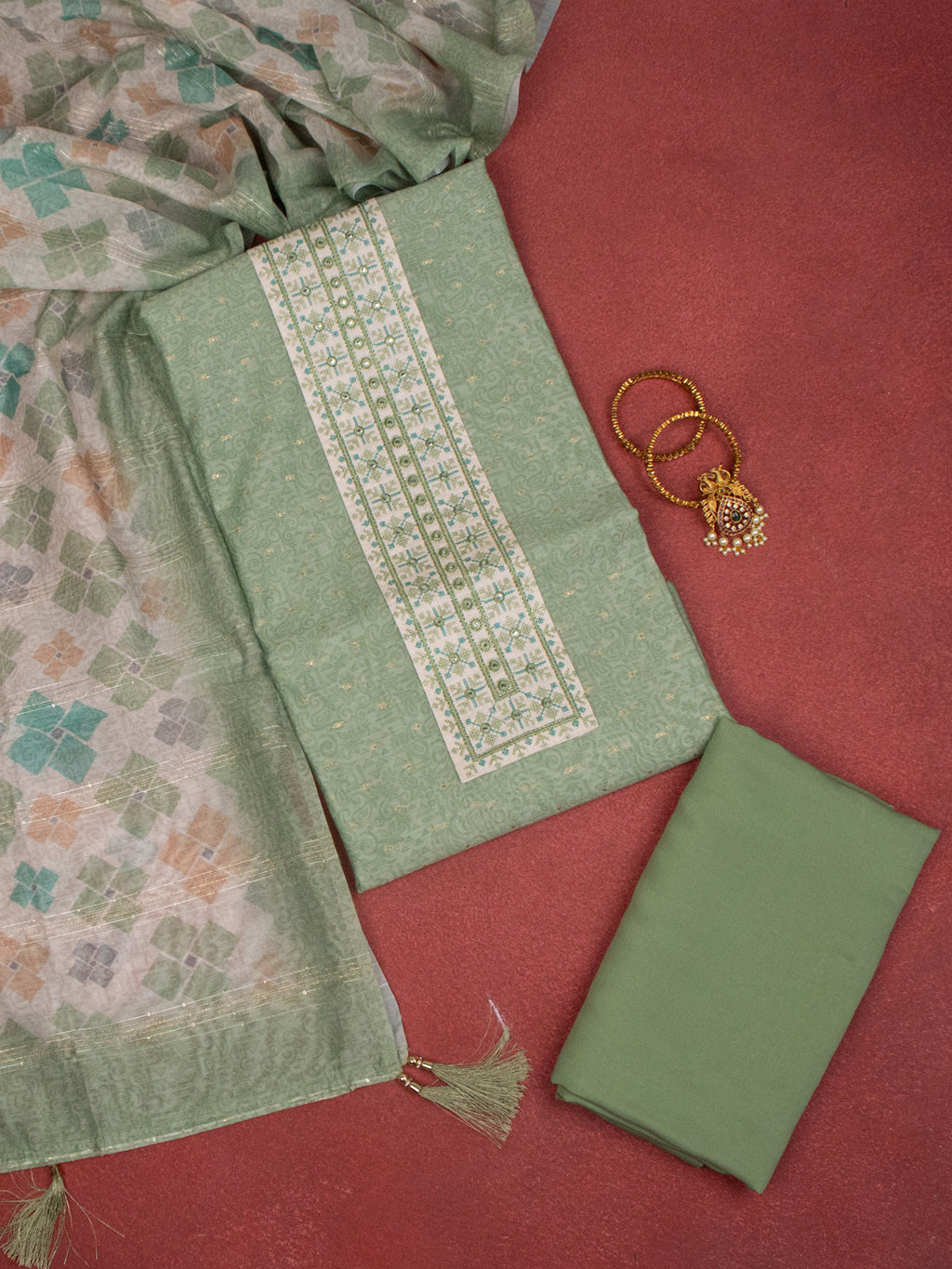 Chanderi dress material elaichi green with allover prints & embroidery mirror work neck pattern and bottom & dupatta