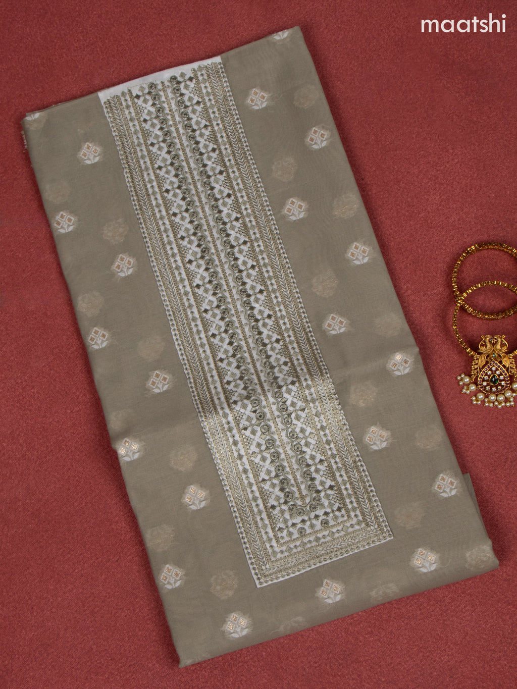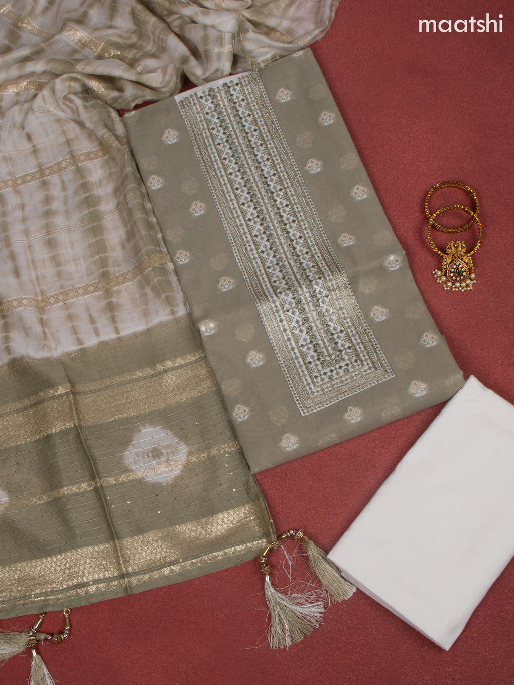 Chanderi dress material grey and white with allover buttas & embroidery mirror work neck pattern and bottom & dupatta