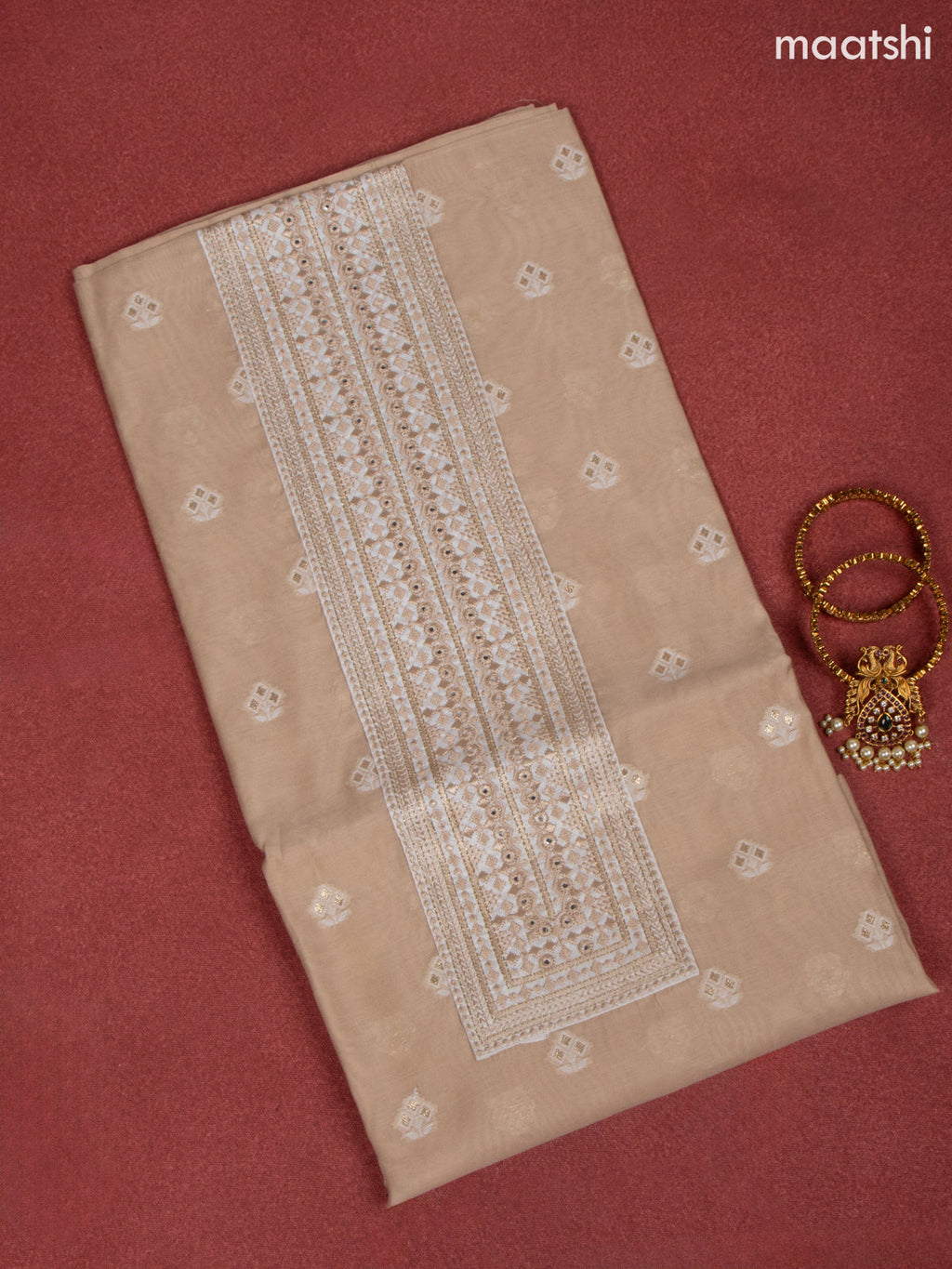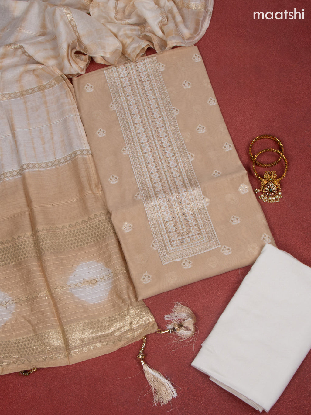 Chanderi dress material sandal and white with allover buttas & embroidery mirror work neck pattern and bottom & dupatta
