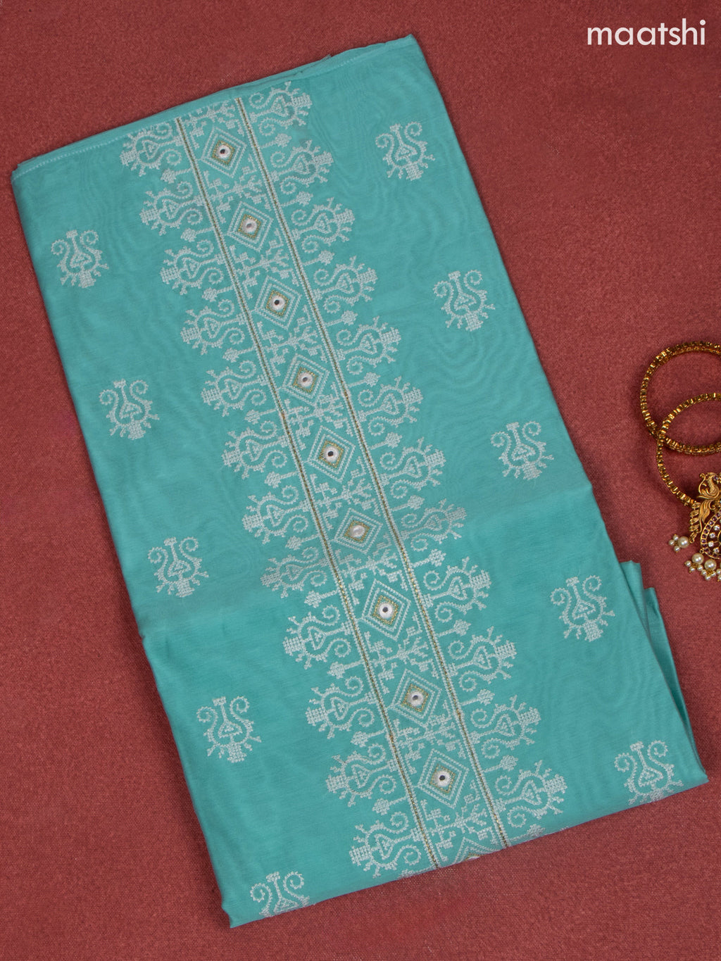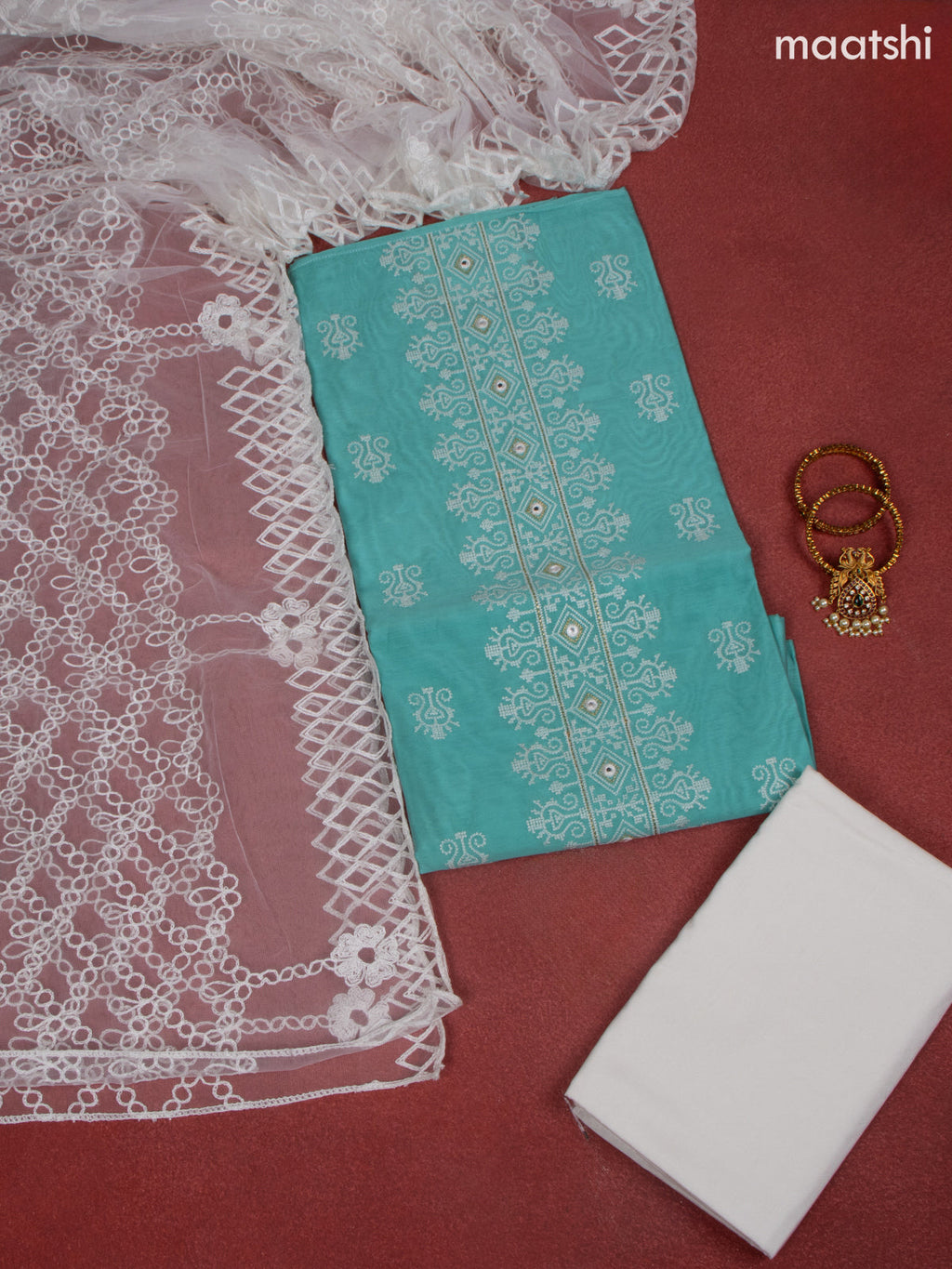 Chanderi dress material teal green and white with allover buttas & embroidery mirror work neck pattern and bottom & dupatta