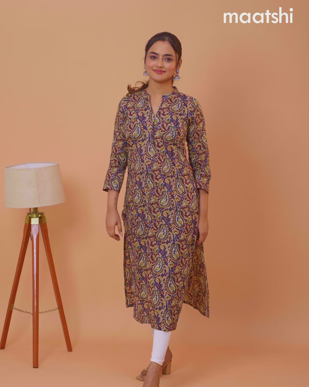 Cotton kurti deep maroon with kalamkari prints & simple neck pattern and without pant