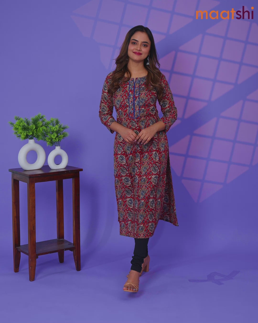 Cotton kurti maroon and blue with allover kalamkari prints & simple neck pattern and without pant