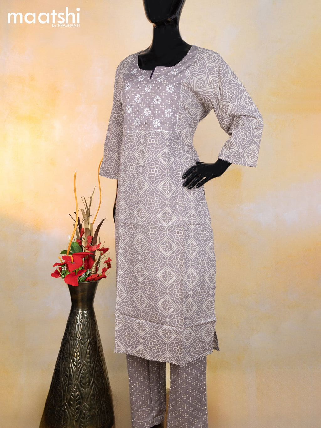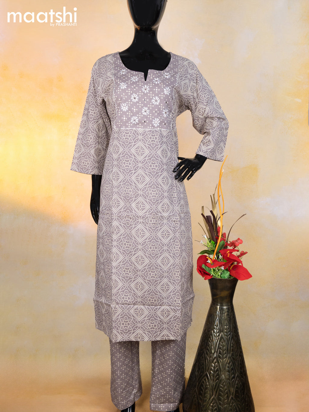Cotton readymade salwar suit grey and beige with allover bandhani prints & embroidery sequin work neck pattern and bottom & cotton dupatta