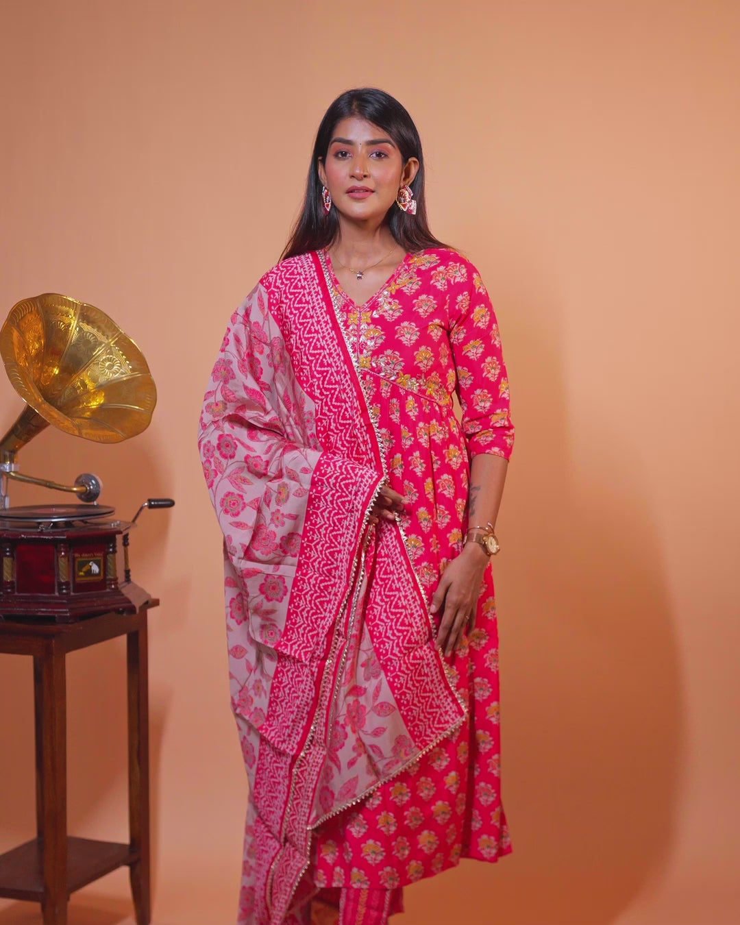 Modal readymade party salwar suit pink with allover prints & alia cut zardosi work neck pattern and straight cut pant & chiffon dupatta