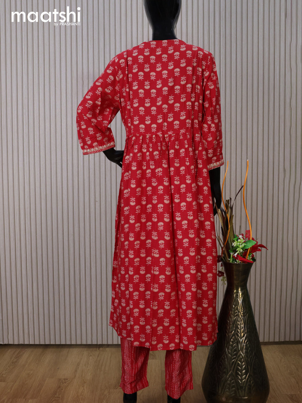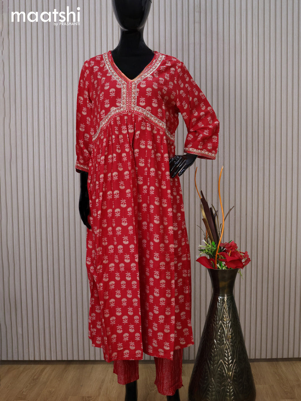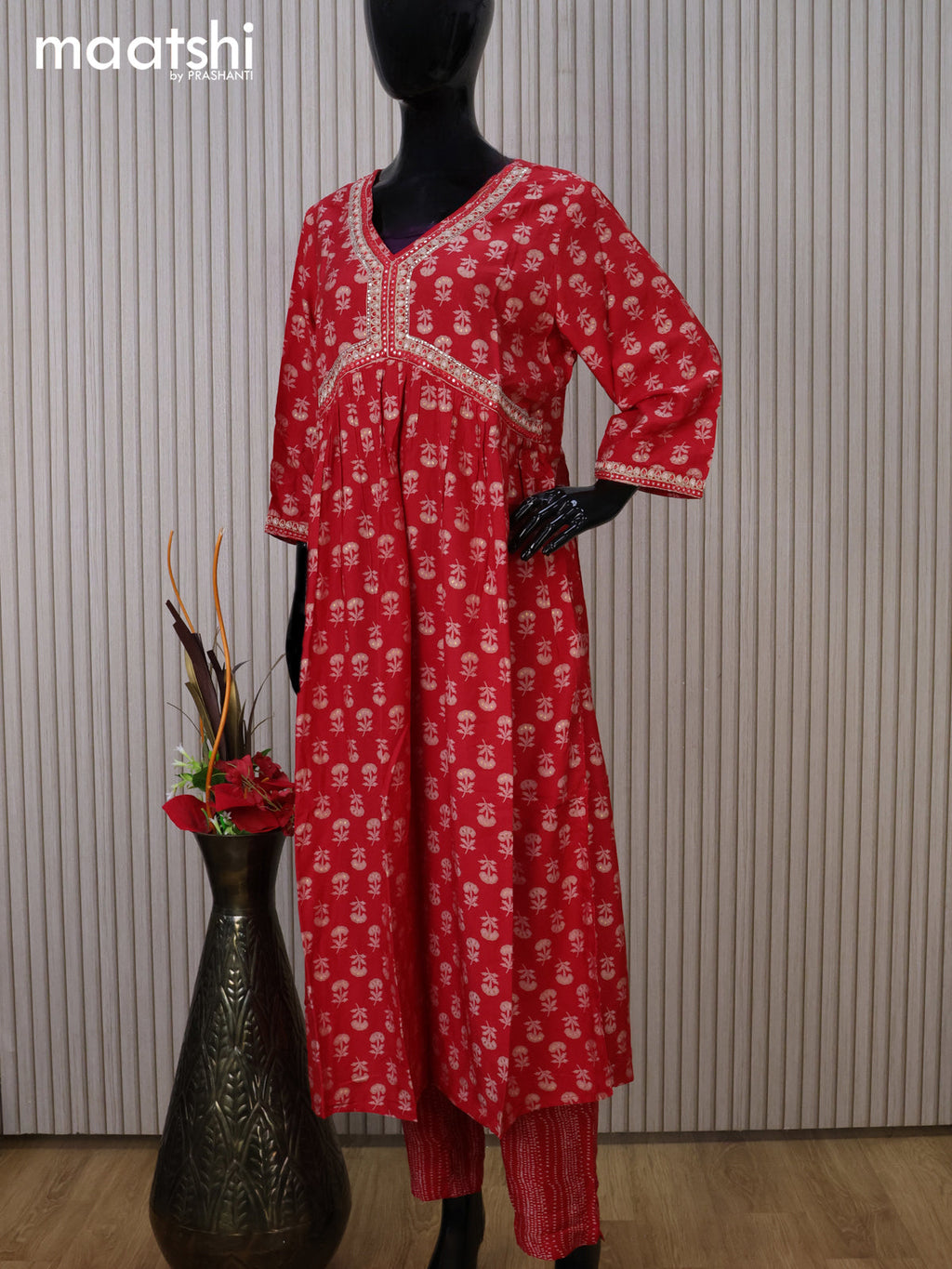 Modal readymade party salwar suit red with allover prints & alia cut beaded work neck pattern and straight cut pant & chiffon dupatta