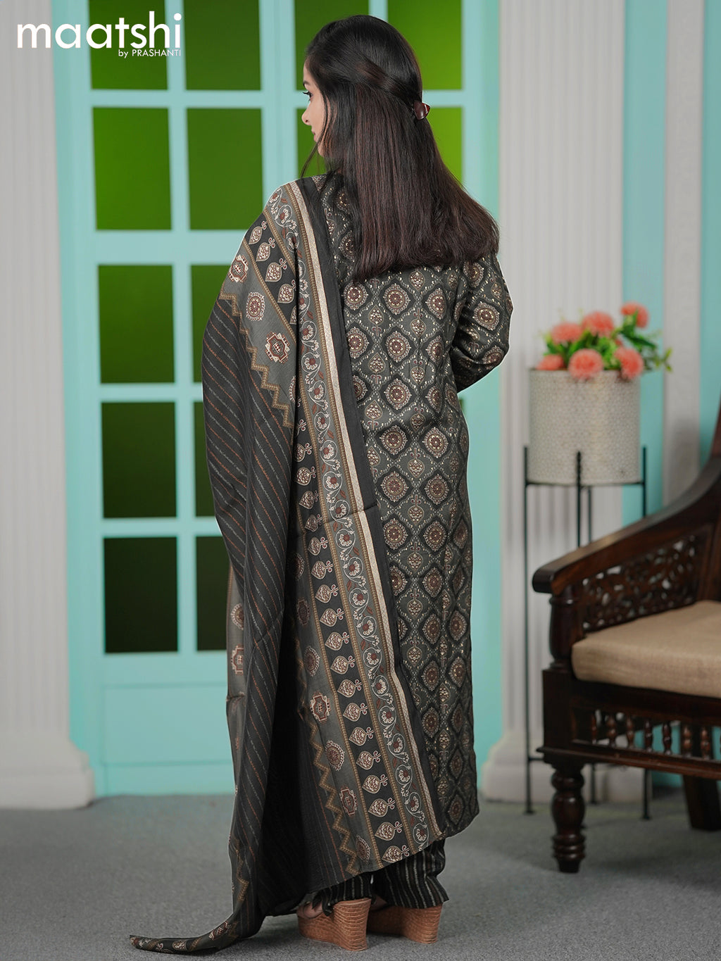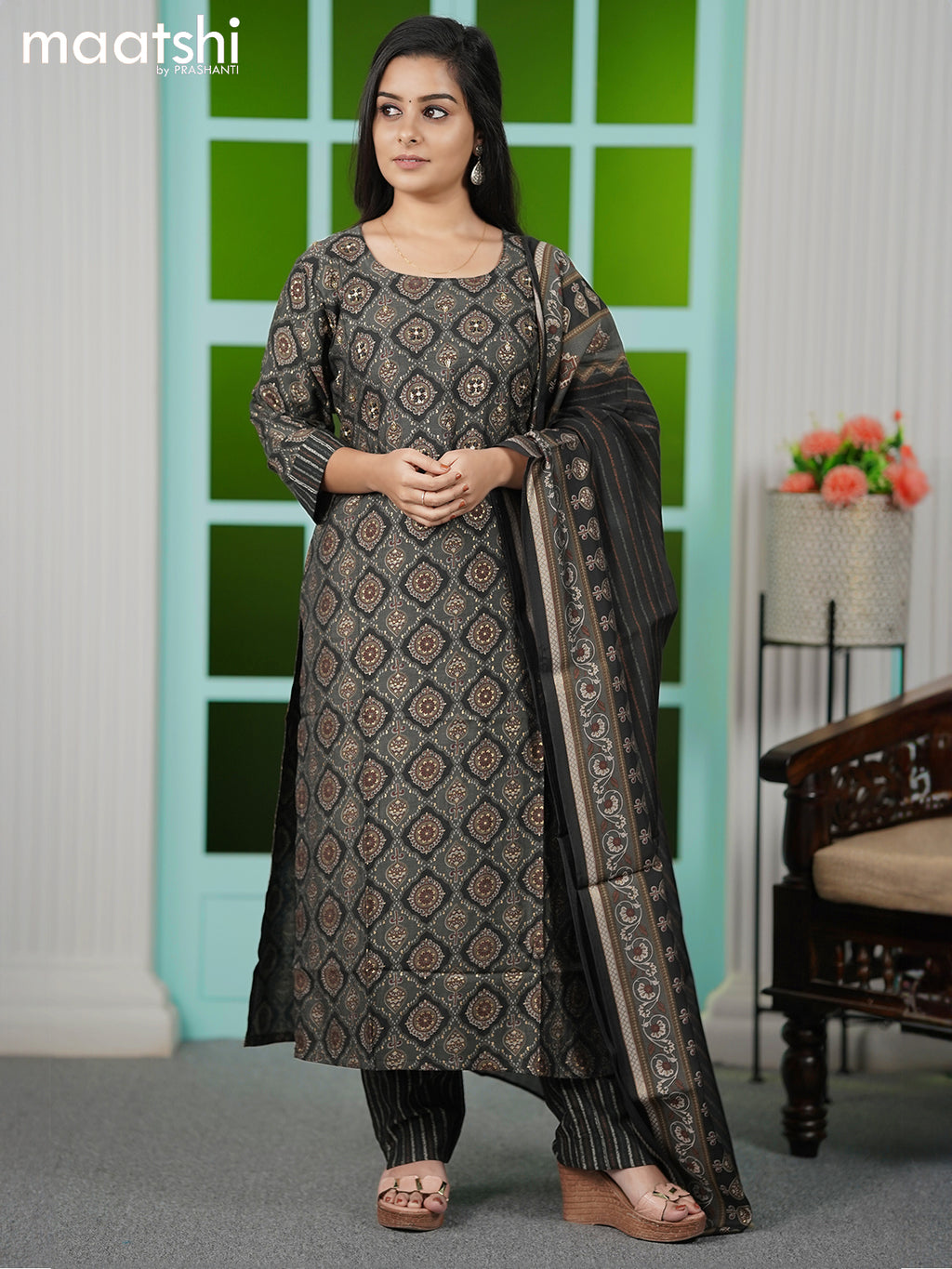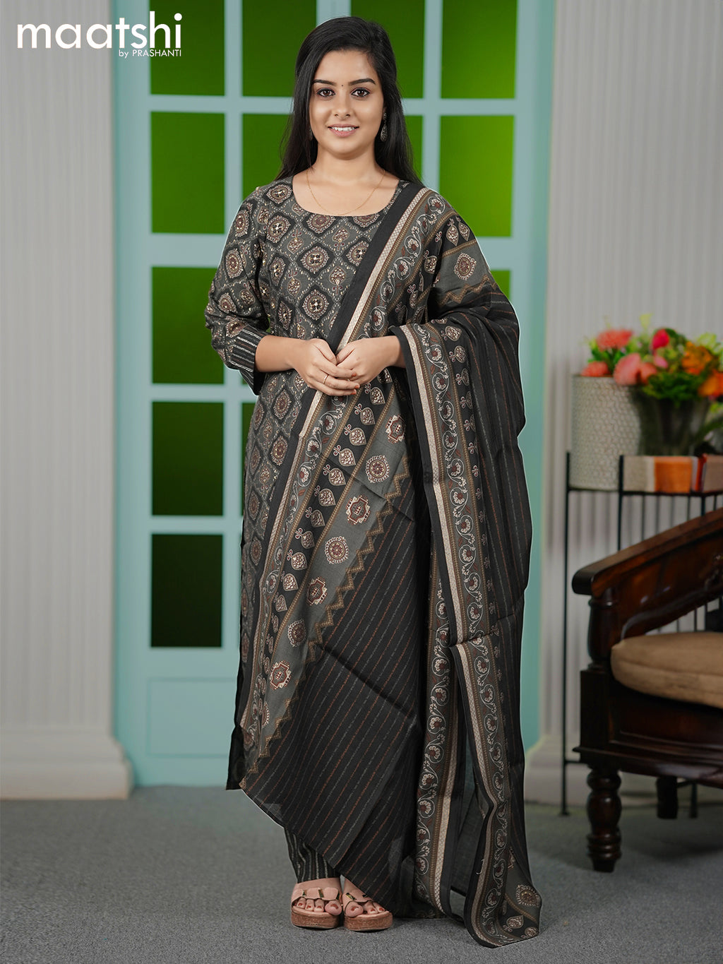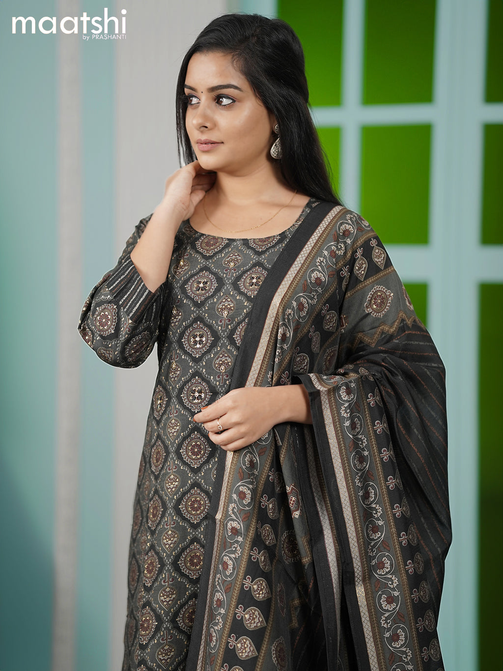 Modal readymade salwar sutis dark grey and with allover butta prints & embroidery work and straight cut pant & printed dupatta