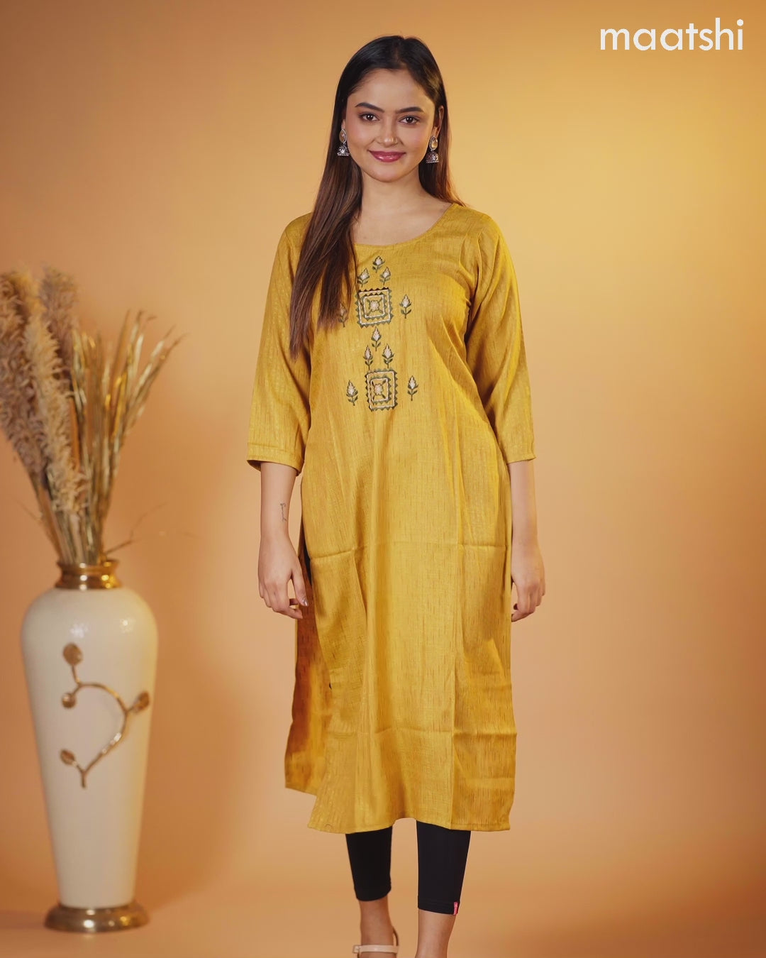 Rayon kurti mustard shade with embroidery work neck pattern without pant