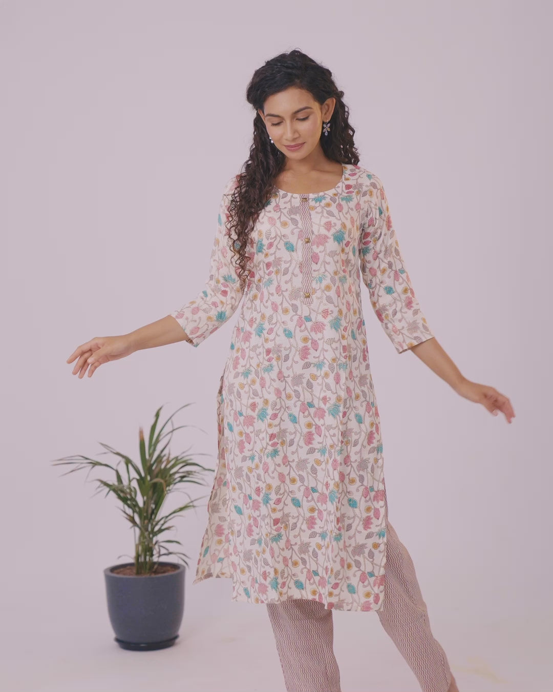 Rayon kurti set off white and multi colour with allover floral prints & simple neck pattern and straight cut pant