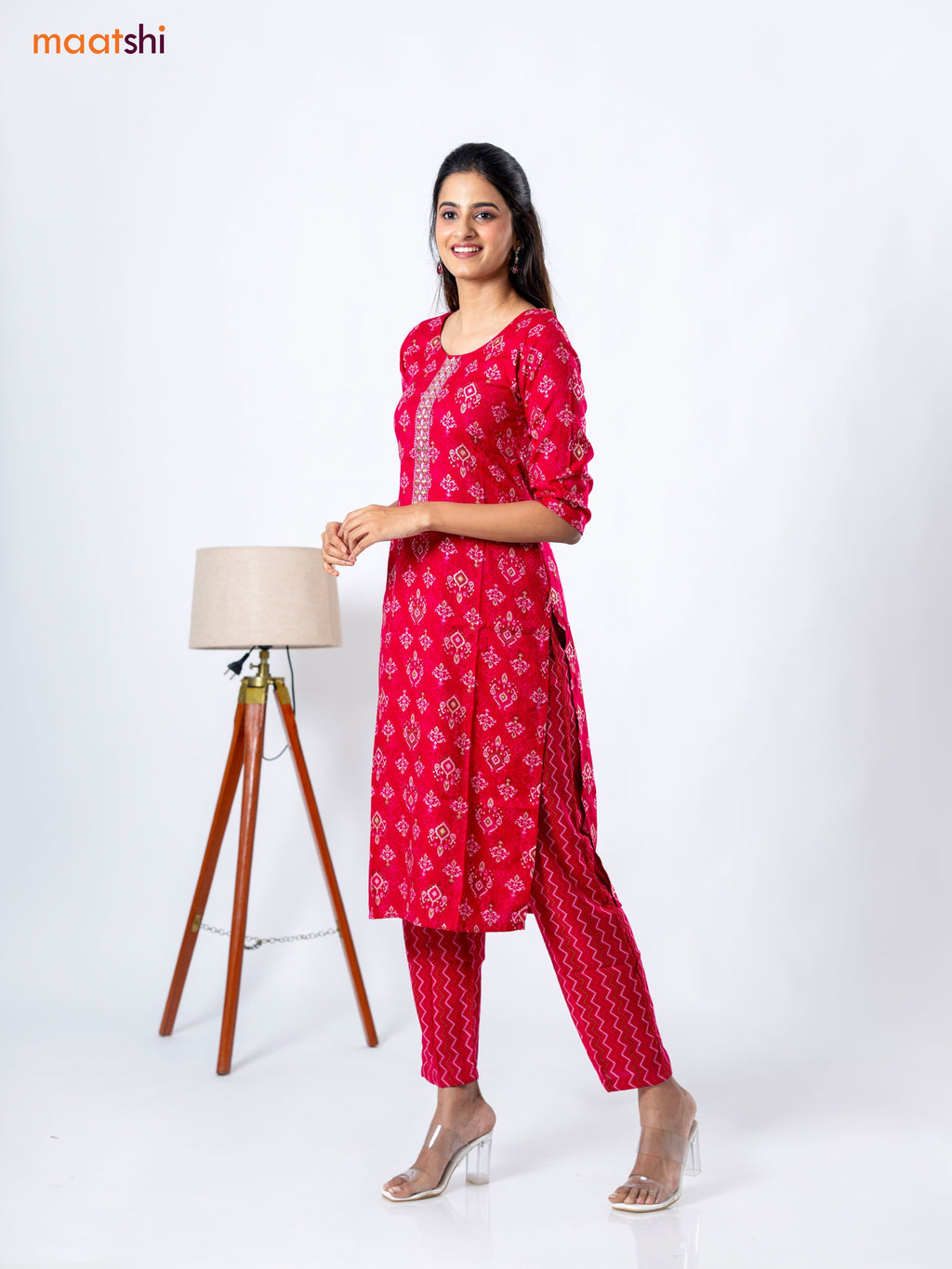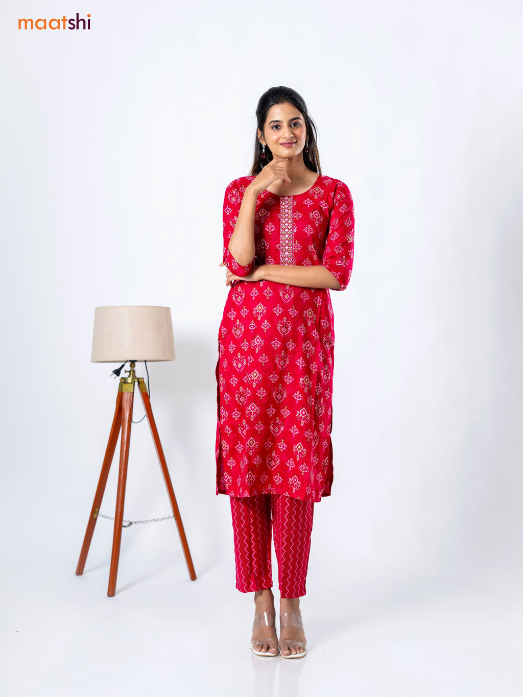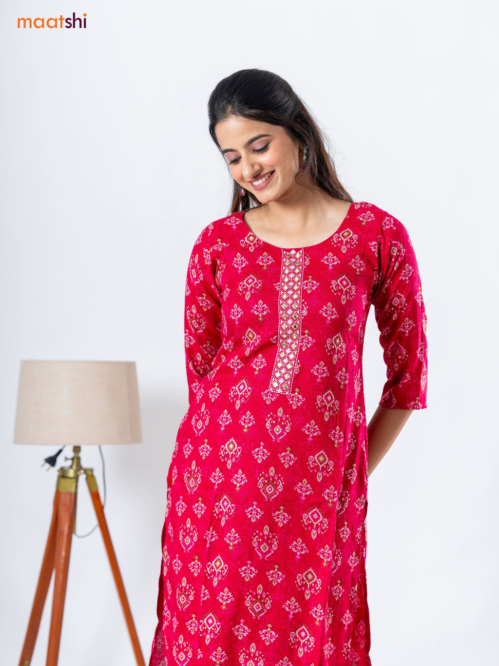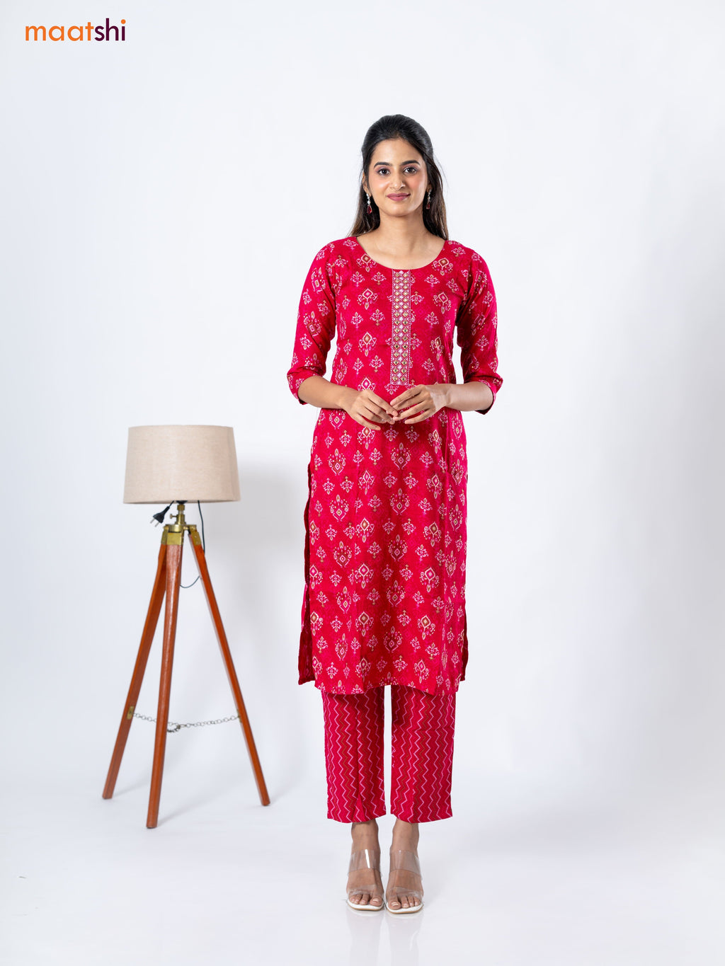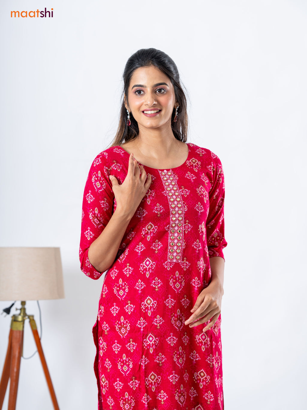 Rayon readymade kurti set pink with allover ikat prints &embroidery work neck pattern and straight cut pant
