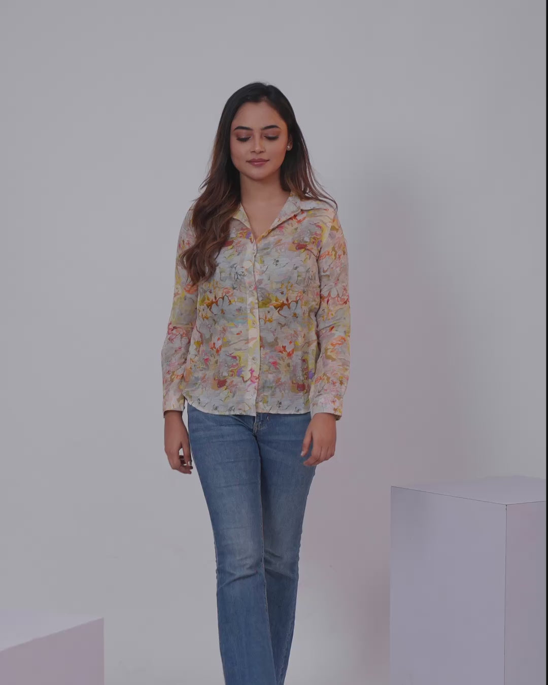 Women's shirt cream with allover floral prints and collar neck pattern